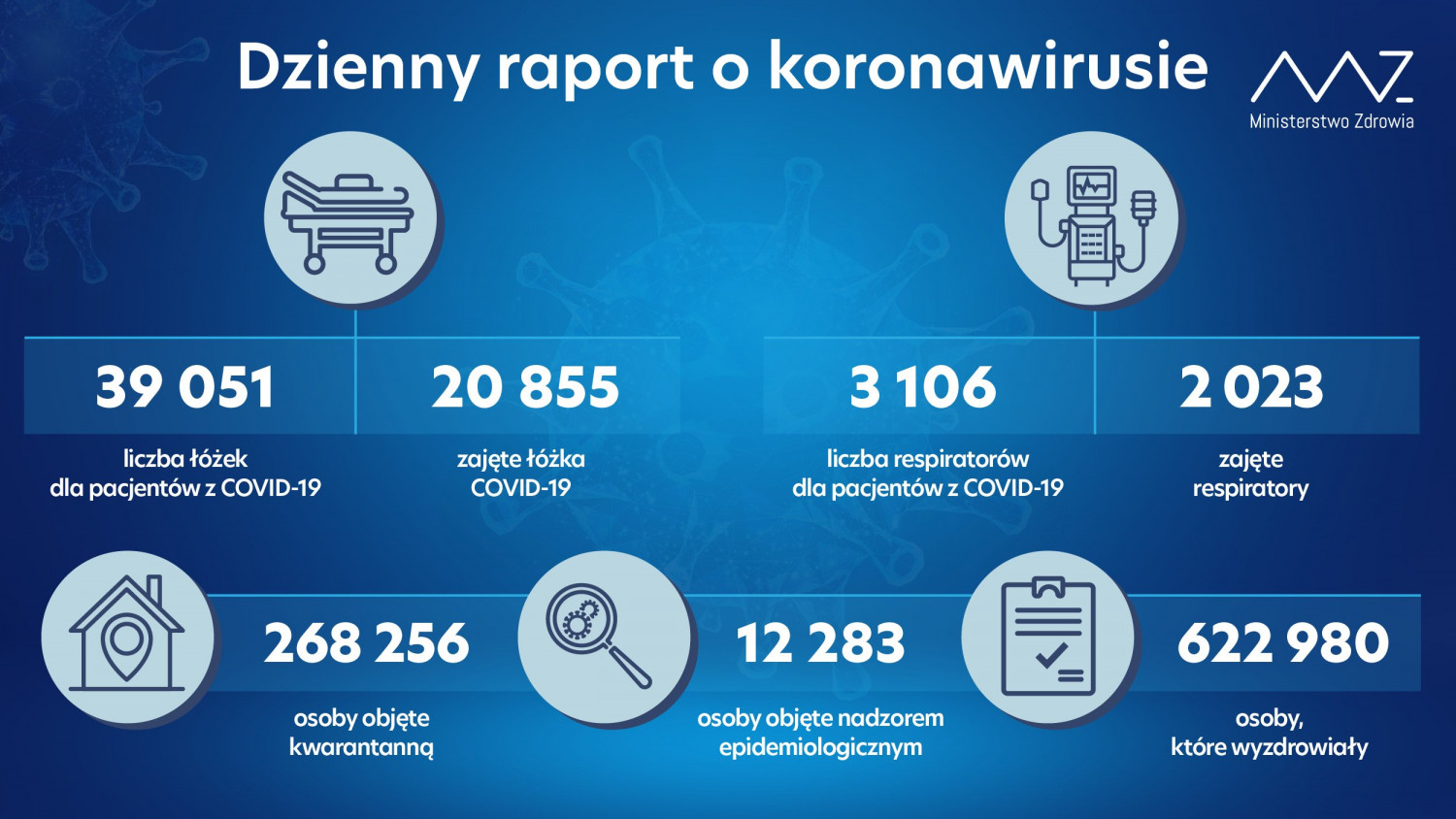 Dzisiaj w kraju zajętych jest przez chorych na COVID-19 20 855 łóżek szpitalnych (496 mniej niż wczoraj). 2 023 pacjentów przebywa pod respiratorem (9 mniej niż wczoraj). Kwarantanną objętych jest 268 256 osób (5 297 więcej niż wczoraj), a nadzorem epidemiologicznym - 12 283 (978 więcej niż wczoraj).