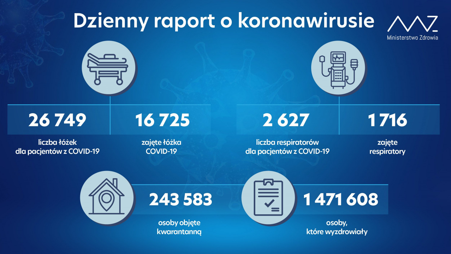 Dzisiaj w kraju zajęte są przez chorych na COVID-19 16 725 łóżka szpitalne (302 więcej niż wczoraj). 1 716 pacjentów przebywa pod respiratorem (41 więcej niż wczoraj). Kwarantanną objęte są 243 583 osoby (8 982 więcej niż wczoraj).