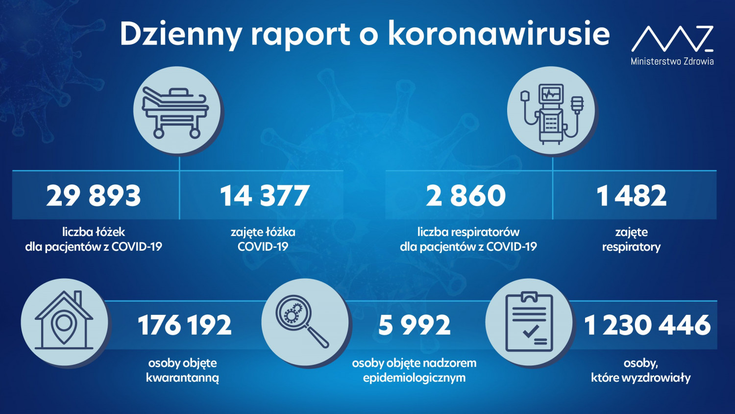 Dzisiaj w kraju zajętych jest przez chorych na COVID-19 14 377 łóżek szpitalnych (151 mniej niż wczoraj). 1 482 pacjentów przebywa pod respiratorem (5 więcej niż wczoraj). Kwarantanną objęte są 176 192 osoby (8 447 niż wczoraj), a nadzorem epidemiologicznym - 5 992 (332 więcej niż wczoraj).