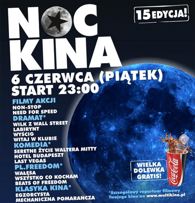 Noc Kina to całonocna impreza filmowa, w trakcie której można oglądać najciekawsze filmy z ostatnich lat. Podczas wydarzenia 1 bilet upoważnia do przemieszczania się między wszystkimi salami oraz kinami.