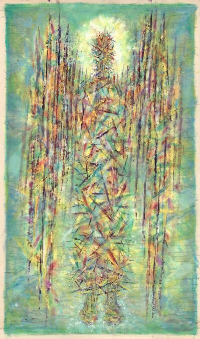 Nie potrafię wyjaśnić, czym jest czas? Spróbowałem natomiast (zgodnie ze swoimi przekonaniami) zastanowić się nad tymi, którzy go pielęgnują. Przyjmując, że aniołowie wsłuchują się w ludzkie myśli, postanowiłem dać temu wyraz. Świadomość naszego współistnienia z nimi w czasie jest motywem sprawczym. Dlatego też wizualizacja Posłańców Niebieskich, jako przewodników działających w doczesności, stała się dla mnie ?programem? plastycznych medytacji. W 1996 roku rozpocząłem realizację cyklu malarskiego ?Opiekunowie czasu?, który miał składać się z 366 wizerunków aniołów. Nie wiedziałem, kiedy zakończę pracę nad całością cyklu. To moje zatrudnienie polegające na ?opisywaniu? duchów czystych stało się długim doświadczeniem i równocześnie analizą własnej intuicji. Systematycznie przyglądałem się znamionom wytworów swojej wyobraźni i osobom, którym dedykowałem poszczególne prace. ?Aniołowie ostatnich dni? to zbiór obrazów wieńczący cykl. Każdy konterfekt przyporządkowałem jednemu dniowi kalendarzowego roku. W ten sposób wypełniłem określoną miarę czasu nadając jej znaczenie symboliczne, otwarte na całą doczesność. ?Powtarzalność? dni roku określa puls czasu zmierzającego ku wieczności, a więc w konsekwencji ma stawać się przejściem do rzeczywistości poza czasem. Zbliżanie się do tej granicy zwiastuje zmianę, przełom, pozazmysłową konfrontację, rozdarcie i dramat. Rozważając moment przejścia, weryfikujemy poglądy, porządkujemy swoje wnętrze. Wielu z nas przygotowując się do tej drogi, często wypatruje przewodnika, mentora, zwiastuna ukojenia, Kogoś, kto będzie oparciem, tłumaczem, który niezawodnie stawi się w ?punkcie granicznym?. Siła sugestii wyzwala potrzebę uzmysłowienia sobie takiej obecności. Obrazy z mojego anielskiego cyklu są więc refleksją skupioną wokół tęsknoty. Posługując się znakiem ? umowną figurą wyprowadzoną z abstrakcji i różnorakich struktur materii ? zarysowałem wyobrażenia bytów przeczuwanych. Postaci Posłańców Niebieskich mają działać jak natchnienia, czyli dobroczynne sygnały na przejściu dla przechodniów, dla tych, którzy wierzą i dla tych, którzy tylko się przyglądają. Zgadzam z Anselmem Grünem twierdzącym, że dostrzeganie istnienia anioła we własnym życiu oznacza rezygnację z chorobliwej koncentracji na histerii zranień i urazów, klęsk i porażek. Dobrze jeśli mamy świadomość obecności kogoś, kto zawsze nam towarzyszy i wspiera niezależnie od nastawienia czy postępowania. Wędrowiec dwóch światów. On uwrażliwia, wskazując drogę ku temu, co wzniosłe i piękne. Niezłomny opiekun jest łącznikiem, między rozpoznaniem i przeczuciem, między tym, co sensualne, a tym, co duchowe.