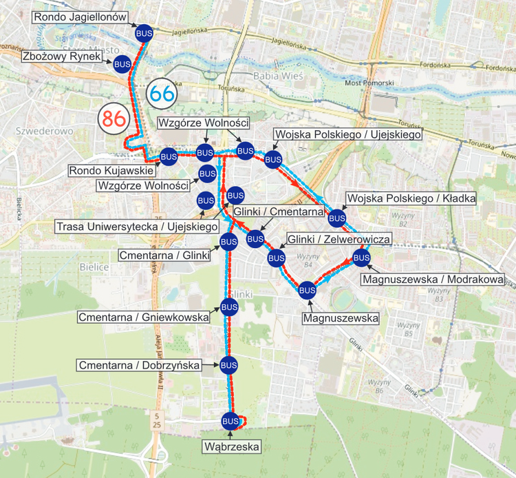 Przywrócona zostanie linia nr 86. Autobusy tej linii kursować będą po identycznej trasie jak linia nr 66, ale w kierunku odwrotnym. Oznacza to, że autobusy pojadą od ronda Jagiellonów ulicami: Kujawską, Wojska Polskiego, Trasą Uniwersytecką, Glinki, Magnuszewską, Wojska Polskiego i przez Kujawską i Bernardyńską wrócą do ronda Jagiellonów. Również wybrane autobusy tej linii dojadą do Wąbrzeskiej.