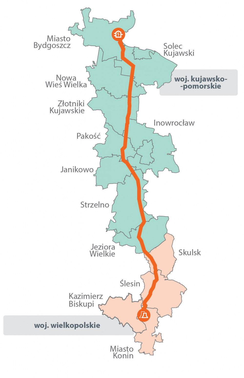 Dwutorowa linia 400 kV Jasiniec - Pątnów będzie miała długość ponad 104 km (9,7 km na obszarze Bydgoszczy). Trasa linii przebiega przez teren 12 gmin (Konin, Ślesin, Skulsk, Jeziora Wielkie, Strzelno, Janikowo, Inowrocław, Pakość, Złotniki Kujawskie, Nowa Wieś Wielka, Solec Kujawski, Bydgoszcz) na obszarze dwóch województw (kujawsko-pomorskie i wielkopolskie).