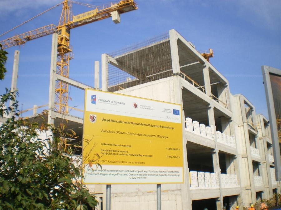 Efekty pracy budowlańców widać też na placu budowy Biblioteki Głównej UKW. Postępy można na bieżąco śledzić za pośrednictwem internetowego Dziennika Budowy Biblioteki Uniwersyteckiej UKW . Na budowę i wyposażenie nowego gmachu książnicy przy ulicy Chodkiewicza trafiło 42,5 miliona złotych z puli Regionalnego Programu Operacyjnego Województwa Kujawsko-Pomorskiego.