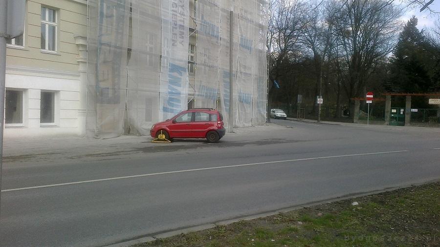 Od czasu do czasu, tak raz w miesiącu, parkującym przy pl. Weyssenhoffa samochodom, niezależnie od strony, bo raz na chodniku przy UKW, raz na narożniku przy ogrodzie Botanicznym, to znów jak na zdjęciu, Straż Miejska zakłada blokady.