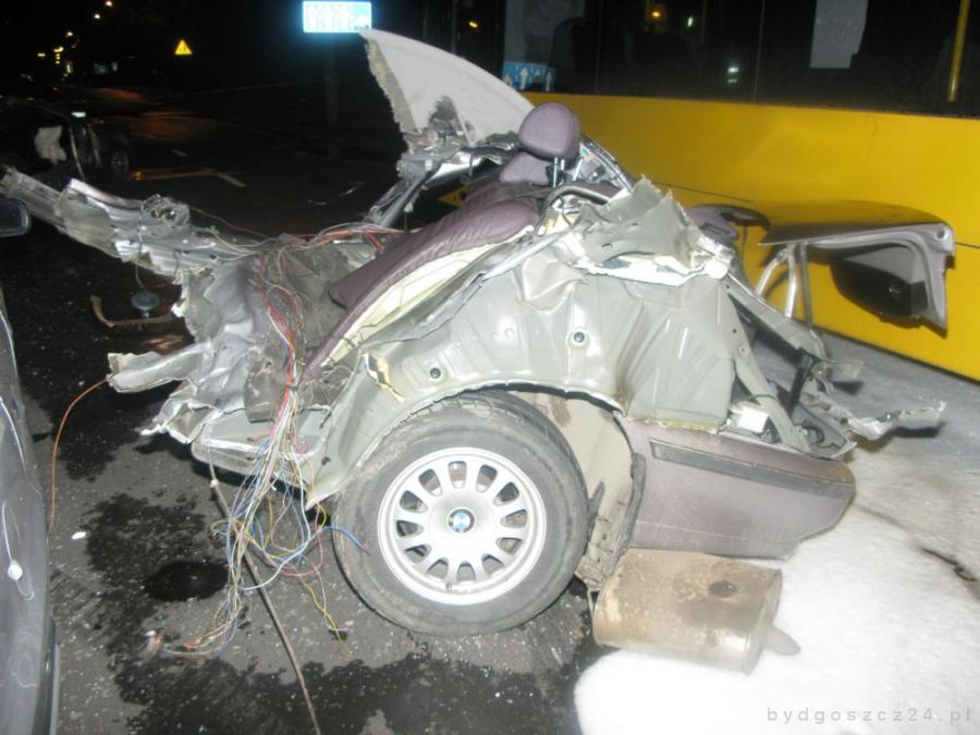 W poniedziałek ok. godz. 23.10 w Bydgoszczy na ulicy Wojska Polskiego doszło do tragicznego w skutkach wypadku. Jak wynika ze wstępnych ustaleń policjantów samochód bmw jadący od strony ulicy Ujejskiego w kierunku centrum miasta uderzył w tył autobusu miejskiego i jadącego obok opla astrę. W wyniku zderzenia bmw praktycznie rozpadło się. Dwóch mężczyzn podróżujących tym pojazdem zginęło na miejscu. Funkcjonariusze ustalają czy tym samochodem podróżowały jeszcze inne osoby. Kierowca i pasażerowie autobusu oraz kierujący oplem nie odnieśli obrażeń. W tej chwili nie wiadomo kto kierował bmw. Kilkanaście minut później na jednej z ulic zatrzymano współwłaściciela pojazdu z obrażeniami głowy. Mundurowi na miejscu przeprowadzali oględziny, zabezpieczali ślady i przesłuchiwali świadków. Ulica Wojska Polskiego na tym odcinku była nieprzejezdna przez kilka godzin. Policjanci pod nadzorem prokuratora wyjaśniają okoliczności i przyczyny tego tragicznego zdarzenia.