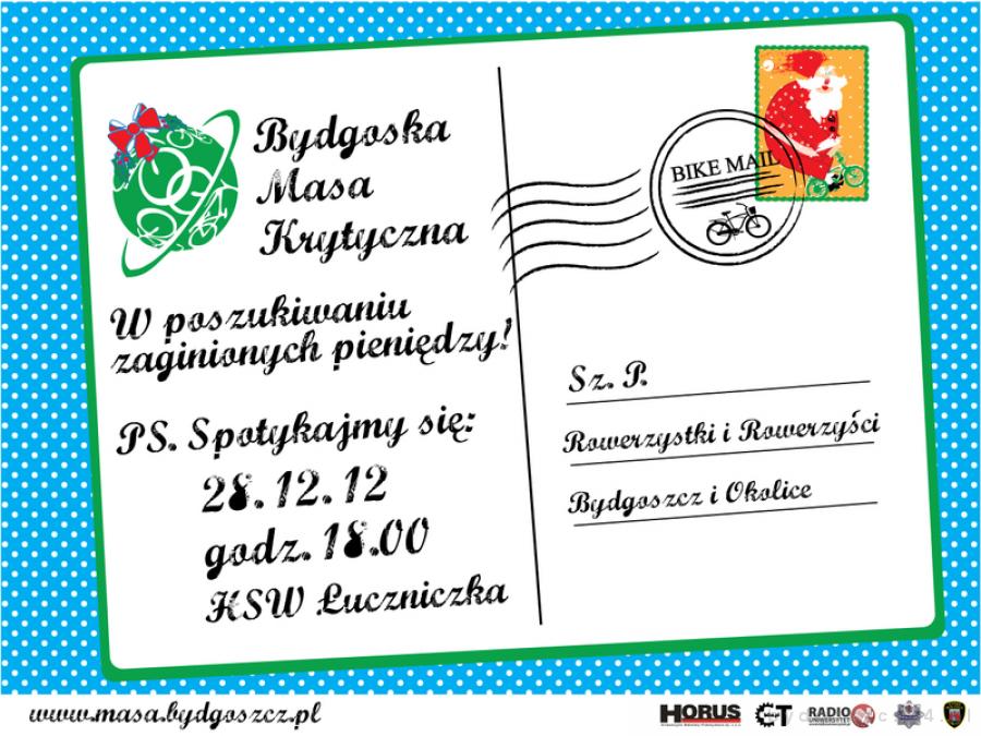 Organizacje skupiające bydgoskich rowerzystów jeszcze w styczniu zapowiadają przedstawienie zestawienia tych wydatków. Na problem tych niezrealizowanych obietnic cykliści będą już zwracać uwagę podczas piątkowej Bydgoskiej Masy Krytycznej, która przejedzie ulicami naszego miasta pod hasłem ?W poszukiwaniu zaginionych pieniędzy?. Peleton miejskich rowerzystów wyruszy w piątek, 28 grudnia o godz. 18:00 spod hali ?Łuczniczka? i przejedzie na Stary Rynek. Po zakończeniu będzie można zdobyć nagrody ufundowane przez sklep internetowy CTBike i naklejki odblaskowe od firmy Horus Innowacyjne Materiały Przemysłowe. Akcja jest zalegalizowana i zabezpieczana przez policję. Organizatorzy przypominają o obowiązkowym oświetleniu rowerów.