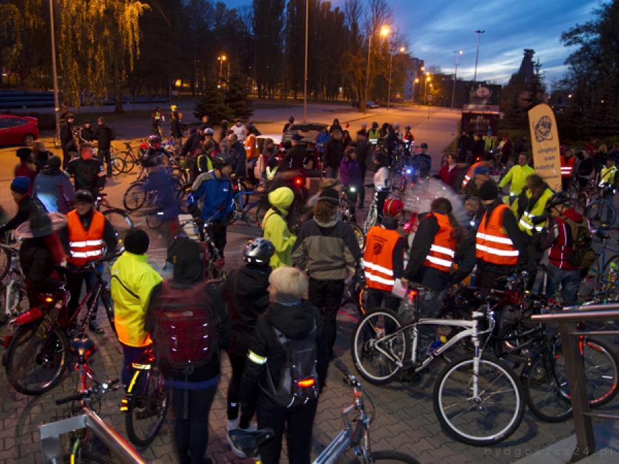 Bydgoska Masa Krytyczna w tym miesiącu ruszyła pod hasłem ?Bądź widoczny, bądź bezpieczny?. Dzisiejszy przejazd miał charakter edukacyjny – celem było pokazanie najmłodszym ważności i konieczności stosowania odpowiedniego oświetlenia roweru po zmroku. Oprócz rozdawanych szprychówek, uczestnicy mogli otrzymać odblaskowe naklejki na rowery. Uzbrojeni w oświetlenie, odblaskowe kamizelki oraz okolicznościowe, halloweenowe stroje ruszyli ulicami oświetlonego już jedynie sztucznym światłem miasta. Dla najbardziej oryginalnie i pomysłowo przebranych rowerzystów przygotowano nagrody niespodzianki.