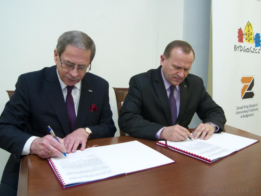 Podpisanie umowy między ZDMiKP i firmą Sprint na zaprojektowanie, zakup, dostawę, montaż i uruchomienie systemu centralnego zarządzania ruchem i transportem w Bydgoszczy odbyło się z udziałem prezydenta Bydgoszczy Rafała Bruskiego i rektora UTP Antoniego Bukaluka.