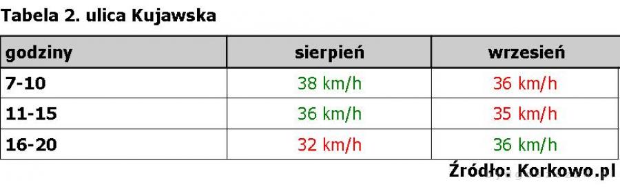 Analizie poddano średnie prędkości, jakie osiągali kierowcy w połowie sierpnia i na początku września na czterech ulicach położonych w centrum miasta. Mówiąc krótko: nie jest źle. Na ulicy Focha ruch zwolnił, ale średnio tylko o 2 km/h. Na ulicy Szubińskiej jeździ się właściwie tak samo, jak w wakacje. Nietypowa okazała się ulica Kujawska. Na Kujawskiej w godzinach między 16 a 20 we wrześniu jeździ się trochę szybciej niż w sierpniu.
