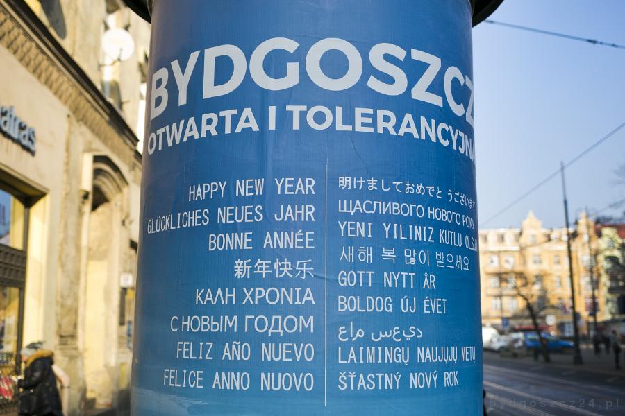 ?Antydyskryminacyjna edukacja? w szkołach jeszcze nie ruszyła. Na razie edukowani są mieszkańcy Bydgoszczy z pomocą ogromnych plakatów na słupach ogłoszeniowych w centrum miasta. Widnieje na nich hasło: ?Bydgoszcz Otwarta i Tolerancyjna? oraz życzenia: ?Szczęśliwego Nowego Roku pełnego wzajemnej przyjaźni i tolerancji wszystkim mieszkańcom Bydgoszczy oraz gościom naszego miasta?.