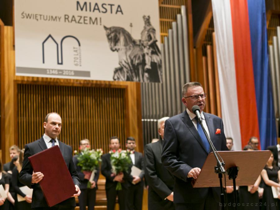 Później nastąpiło składanie życzeń Jubilatce i bydgoszczanom. Wicewojewoda Józef Ramlau stwierdził, że nasze miasto sprostało królewskim oczekiwaniom, jakie pokładał w Bydgoszczy Kazimierz Wielki. – Współczesna Bydgoszcz z dumą dzierży ustawą przydaną godność stolicy regionu. Mierzy, jakże wysokie, iście królewskie standardy. Stołeczność jest przywilejem, ale i wyzwaniem. Życzę, aby dzisiejsza Bydgoszcz była wzorem współpracy z otoczeniem tak bliskim, jak i dalszym – mówił Ramlau.