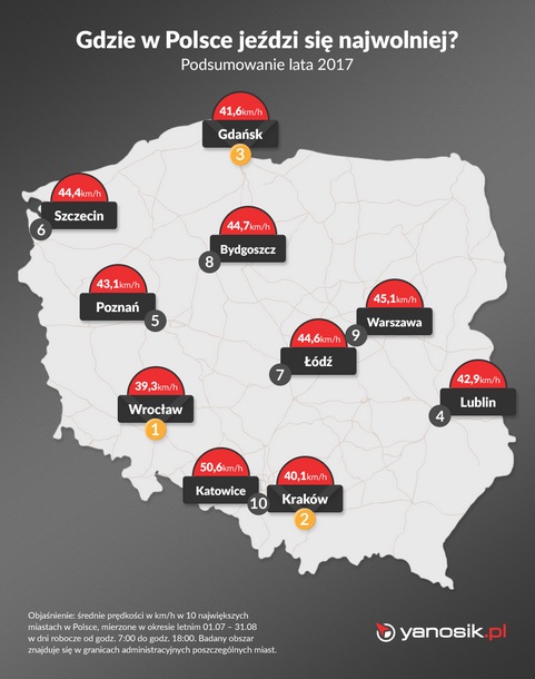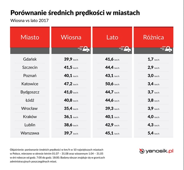 – Na podstawie danych z systemu Yanosik sprawdziliśmy jak kształtowała się w okresie wakacyjnym średnia prędkość w największych miastach w Polsce. W analizie wzięliśmy pod uwagę dni robocze w godzinach 7:00-18:00. Dało nam to pogląd na sytuację, jaka panuje w polskich miastach podczas letnich miesięcy. Jak się okazuje w niektórych przypadkach jest ona diametralnie inna niż w okresie wiosennym – stwierdza Paweł Bahyrycz z firmy Yanosik.