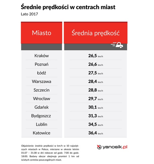 Specjaliści systemu Yanosik przeanalizowali także sytuację kierowców w centrach miast. W niektórych przypadkach prędkość diametralnie spadła w stosunku do pozostałego obszaru miasta. Najwolniej w centrum jeździło się latem w Krakowie, następnie w Poznaniu, Łodzi, Warszawie, Szczecinie i Wrocławiu. W miastach tych prędkościomierze pokazują średnią prędkość poniżej 30 km/h. Nieco szybciej jeździ się w Gdańsku i Bydgoszczy. Miastami o najszybszym centrum w sezonie letnim okazały się Katowice oraz Lublin. Skąd wynikają takie różnice?