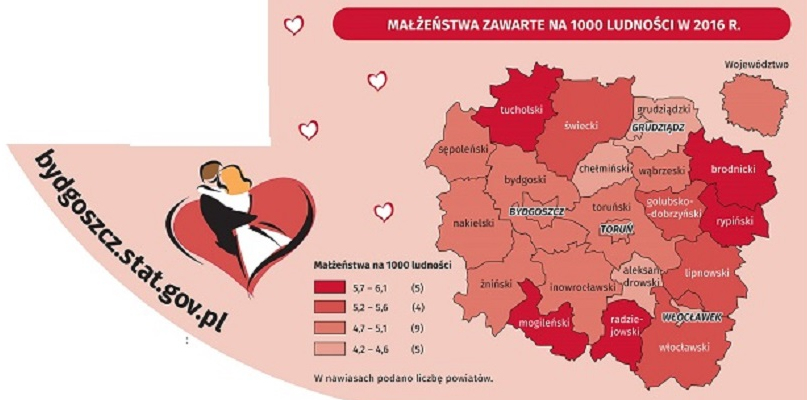 I na koniec dane ukazujące, gdzie zawieranie małżeństw cieszy się największą popularnością, gdzie ich liczba w przeliczeniu na 1000 mieszkańców jest najwyższa. Tutaj daje się zauważyć taką prawidłowość: w powiatach na rubieżach regionu małżeństwa zawierane są częściej (powiaty tucholski, brodnicki, rypiński, radziejowski, mogileński). Na 1000 mieszkańców co roku miłość ślubuje tam 6 par. Dziwić może słaba pozycja w tej klasyfikacji powiatu chełmińskiego z jego stolicą - polskim miastem zakochanych. Razem z czterema innymi zajmuje ostatnie miejsce z liczbą niewiele przekraczającą 4 zawartych małżeństw na 1000 mieszkańców. To powinno być wyzwaniem nie tylko dla świętego Walentego!