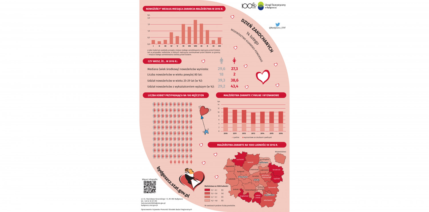 Urząd Statystyczny w Bydgoszczy z okazji Dnia Zakochanych (14 lutego) przygotował informacje na temat zawieranych małżeństw w województwie kujawsko-pomorskim.