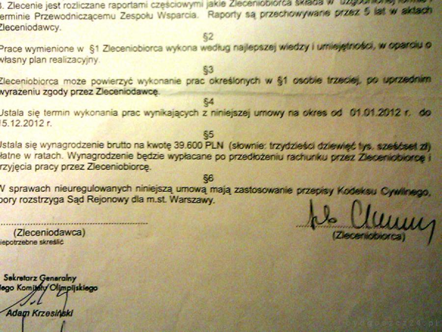 20 lutego 2012 roku PKOl zawarł z zastępcą Rafała Bruskiego umowę zlecenie. A może musiał zawrzeć? Paragraf pierwszy umowy mówi, że zleceniobiorca będzie wykonywał prace, związane z realizacją zadania Ministra Sportu i Turystyki ?Wspieranie procesu przygotowań olimpijskich do Igrzysk Olimpijskich w Londynie 2012 i Soczi 2014?. Rozumieć przez to należy, że ministra Mucha przekazała PKOl-owi środki na wynagrodzenie dla Chmary.