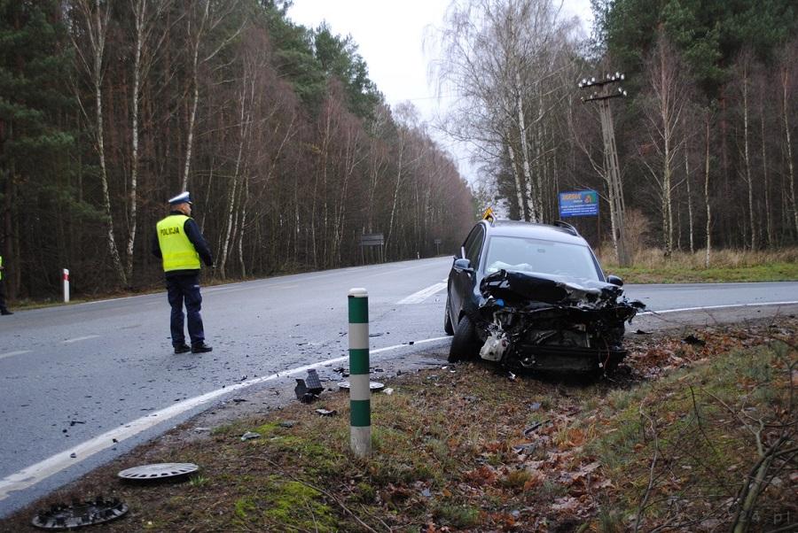 Prawidłowo jadący samochód ciężarowy uderzony przez golfa stracił równowagę. Ciągnik siodłowy wraz z naczepą wylądował w rowie. Od uderzenia cały przód golfa został zmiażdżony, natomiast kierującej samochodem 46-letniej mieszkance Czerska nic się nie stało. Trafiła jednak na obserwację do szpitala.