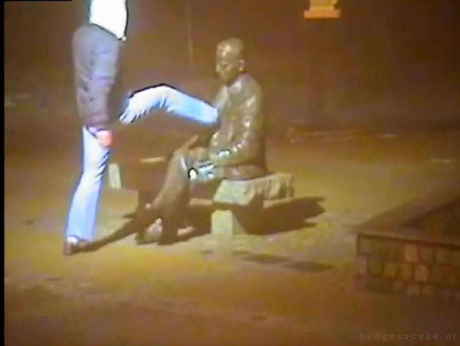 Wczoraj, 17 grudnia, tuż przed północą pracownicy monitoringu miejskiego zauważyli grupkę agresywnie zachowujących się osób przy rzeźbie Mariana Rejewskiego przy ulicy Gdańskiej. Mężczyzna w kapturze z furią zaatakował notatnik, który stanowi element pomnika. Postanowił go nogą oderwać. To nie był koniec jego wybryków. Idąc przez miasto z nogi potraktował również śmietnik oraz bankomat.