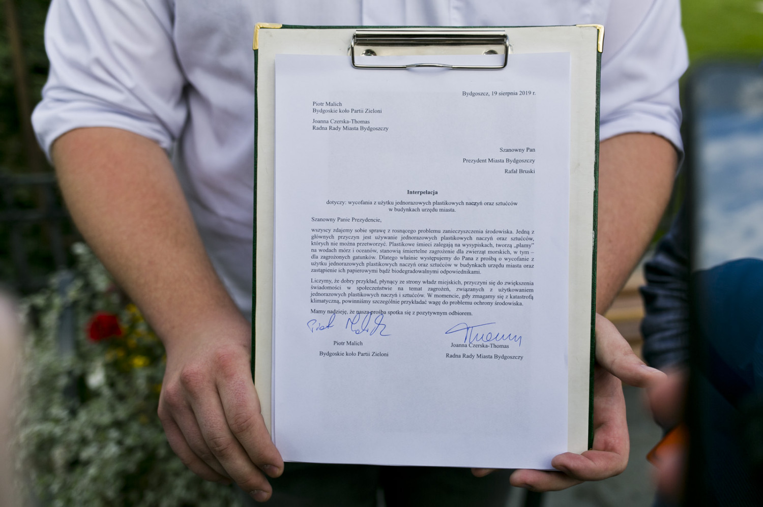 Radna Koalicji Obywatelskiej Joanna Czerska-Thomas i lider Zielonych w Bydgoszczy Piotr Malich apelują do prezydenta Rafała Bruskiego o rezygnację z plastikowych opakowań w bydgoskim urzędzie miasta.