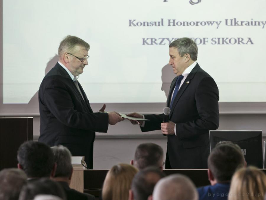 - Rola konsula honorowego polega przede wszystkim na budowaniu dobrych relacji między państwem, które reprezentuje a państwem, w którym funkcjonuje – stwierdził prezydent WSG, wyrażając nadzieję, że podoła nowym zadaniom. Jak wyznał, urodził się na wschodnim krańcu Polski, blisko granicy z Ukrainą i czuje sentyment do tego kraju.