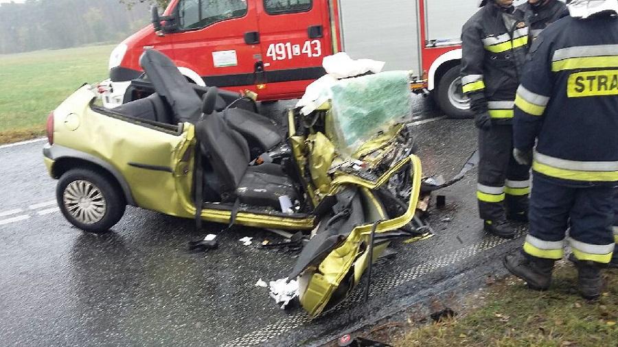 Dzisiaj przed godziną 10.00 w miejscowości Wieszki na trasie Szubin – Nakło doszło do tragicznego w skutkach wypadku. Kierujący samochodem marki Opel Corsa, jadąc w kierunku Nakła, na łuku drogi wpadł w poślizg. W jego wyniku zjechał na przeciwległy pas ruchu, gdzie zderzył się z nadjeżdżającą z przeciwka ciężarówką.