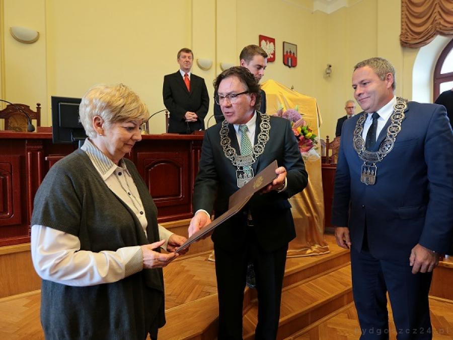Uroczystość nadania tytułu Honorowego Obywatela Miasta wypełniła pierwszą część dzisiejszej sesji Rady Miasta. Rozpoczęło ją odegranie hejnału Bydgoszczy. Przybyłych na uroczystość gości przywitał przewodniczący Rady Miasta Zbigniew Sobociński, a wiceprzewodniczący Jan Szopiński wygłosił laudację.