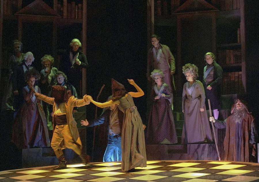 Scenografia Stephana Dietricha sytuuje całą akcję w monumentalnej bibliotece, eksponując humanistyczne przesłanie dzieła. Wielka szachownica na podłodze symbolizuje ciągłą rozgrywkę między dobrem a złem, fałszem i prawdą.