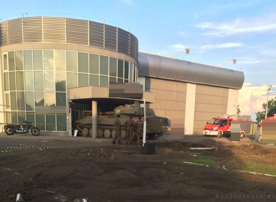 Wczoraj w Szubinie, przed Mono Clubem, odbywała się impreza pod hasłem “Army of Mono. Wielkie manewry szubińskie”. Na placu przyległym do klubu, jego właściciel zorganizował festyn militarny, którego jedną z atrakcji miał być pokaz możliwości samobieżnej haubicy. Za sterami haubicy siedział jej właściciel, będący też właścicielem klubu. Kiedy pojazd przemieszczał się po wygrodzonym terenie, najprawdopodobniej doszło do awarii skrzyni biegów oraz układu hamulcowego i haubica wjechała wprost w drzwi wejściowe budynku.