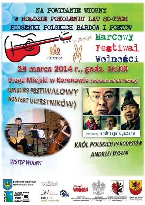 - Zapraszam na IV Marcowy Festiwal Wolności, który jest hołdem dla niezłomnych ludzi naszego narodu, walczących o wolność i prawdę w latach 80-tych – zachęca w zaproszeniu – skierowanym również do bydgoszczan – Piotr Kubiak. Festiwal rozpocznie się w sobotę, 29 marca, o godz. 16 w koronowskim urzędzie (wejście od ul. Farnej).