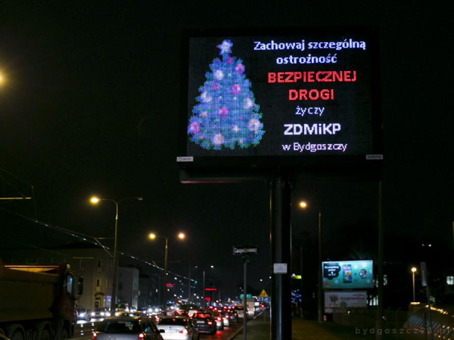 Stojąc w korkach, kierowcy czytają umieszczone na tablicach życzenie świąteczne od ZDMiKP. Do bezpiecznej jazdy nie potrzeba nikogo namawiać. Jadąc w tempie 5 km na godzinę, trudno spowodować groźny wypadek.