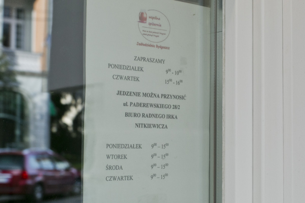 „Wspólna spiżarnia” przy Gdańskiej w Bydgoszczy jest czynna dwa razy w tygodniu przez godzinę. Ale można jedzenie przynosić do lokalu przy Paderewskiego 28/2, w którym mieści się biuro europosła Janusza Zemkego oraz, jak wynika z komunikatu na szybie okna jadłodzielni, także biuro radnego Irka Nitkiewicza.