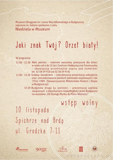- 11.00 – 12.30 ? Mali patrioci ? rodzinne warsztaty plastyczne dla dzieci w wieku od 6 do 12 lat, Centrum Hobbystyczne Faramuszka (obowiązują wcześniejsze zapisy pod numerami tel. 52 58 59 910 lub 52 58 59 914)