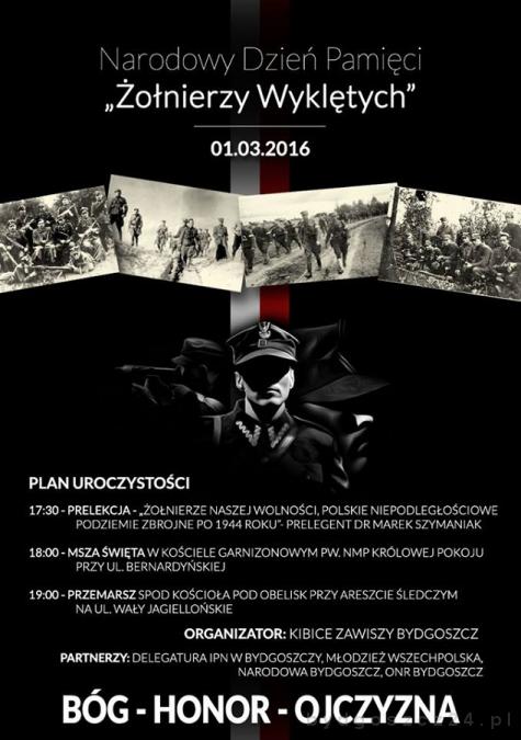 Kibice Zawiszy we współpracy z Delegaturą Instytutu Pamięci Narodowej w Bydgoszczy, Młodzieżą Wszechpolską, Narodowa Bydgoszczą i ONR Bydgoszcz zapraszają na przemarsz ku czci Żołnierzy Wyklętych. Marsz wyruszy o godz. 19 we wtorek, 1 marca, spod kościoła garnizonowego.