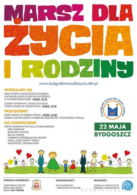 V Marsz dla Życia i Rodziny rozpocznie się Mszą św. w bydgoskiej katedrze o godzinie 12.30. Podczas Eucharystii będzie można podjąć Duchową Adopcję Dziecka Poczętego, czyli objąć modlitwą człowieka, którego życie jest zagrożone zabiciem w łonie matki. Po Mszy św. (ok. godz. 13.30) Diakonia Społeczna Ruchu Światło-Życie Diecezji Bydgoskiej przedstawi na Starym Rynku scenkę teatralną, związaną z 1050-leciem Chrztu Polski.