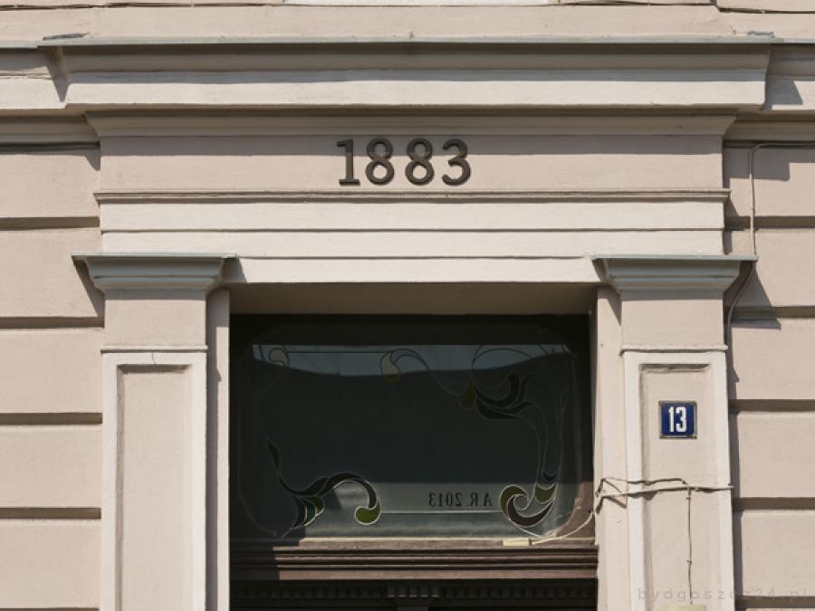 Całkiem niedaleko natrafiliśmy na kolejną kamienicę z rokiem wybudowania uwiecznionym nad bramą. Chodzi o budynek przy ul. Sienkiewicza 13. Liczba 1883 wskazuje, iż kamienica ta powstała dwa lata wcześniej niż narożny budynek na placu Piastowskim.