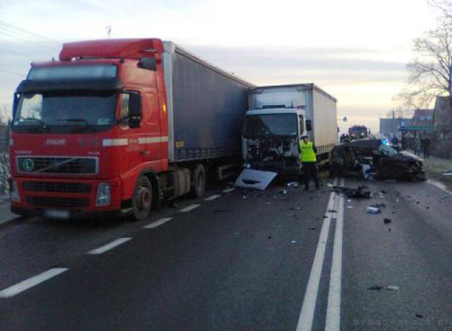 Ze wstępnych ustaleń funkcjonariuszy wynika, że sprawcą gigantycznego karambolu na drodze jest kierujący VW Polo, który wyjeżdżając z drogi podporządkowanej nie zastosował się do znaku ?stop? i zderzył się z kierującym pojazdem marki Seat. W wyniku uderzenia volkswagen został przepchnięty i zderzył się z samochodem ciężarowym marki Reanult, którego kierowca próbował uniknąć zderzenia, zjechał na pobocze i uderzył w stojący pojazd ciężarowy marki Volvo.
