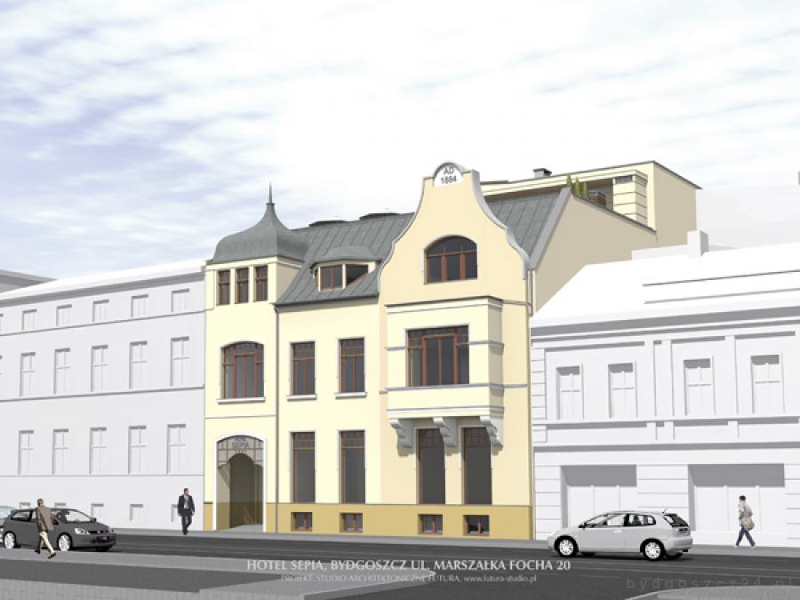 Dzisiaj na konferencji prasowej inwestor firma Cube sp. z o.o. i generalny wykonawca firma Dekpol sp. z o.o. przedstawili koncepcję realizacji Hotelu Sepia. Projekt budowy hotelu zakłada zmianę sposobu użytkowania, przebudowę i rozbudowę budynku przy ul. Focha. W miejscu, gdzie stanie hotel dzisiaj jest budynek frontowy ze skrzydłem oficyny i przybudówką biurową, budynek gospodarczy, dwa budynki garażowe. Budynki te usytuowane są na 3 sąsiadujących ze sobą działkach, które posiadają kształt regularny, zbliżony do prostokąta. Budynek frontowy usytuowany jest w pierzei ulicy Focha i stanowić będzie część frontową Hotelu Sepia. Pozostałe zabudowania zostaną wyburzone, a w podwórzu kamienicy dobudowane zostaną 4 kondygnacje, w których mieścić się będzie zasadnicza część hotelu.