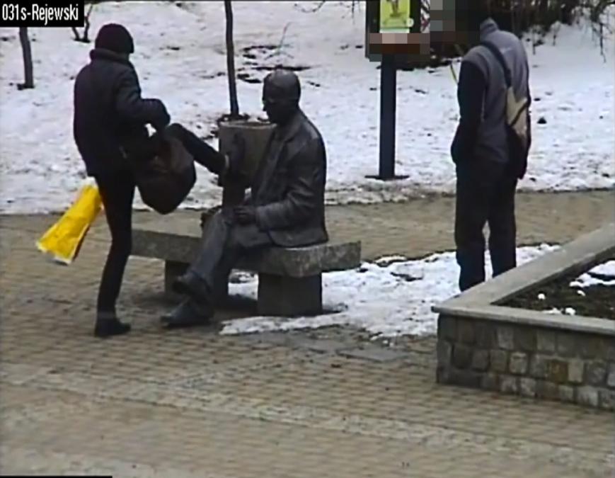 Pracownicy miejskiego monitoringu zauważyli przy ulicy Gdańskiej parę, która podchodzi do pomnika Mariana Rejewskiego. Jak się okazało, nie byli oni zainteresowani postacią i historią kryptologa tylko jego notatnikiem. Kobieta zamaszystym kopniakiem wytrąciła mu go z ręki, a następnie schowała do torebki i wspólnie z partnerem udała się w kierunku ulicy Śniadeckich.