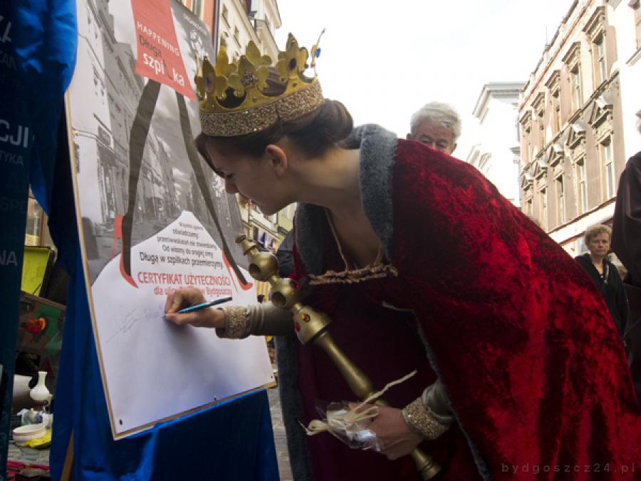 U kresu obchodu królowa Jadwiga złożyła zamaszysty podpis pod certyfikatem użyteczności dla ulicy Długiej w Bydgoszczy, znaczy się białogłowy mogą swobodnie przechadzać się ulicą Długą bez obawy o całość swoich pantofli, a Łuczniczka może śmiało sandały wymienić na szpilki.