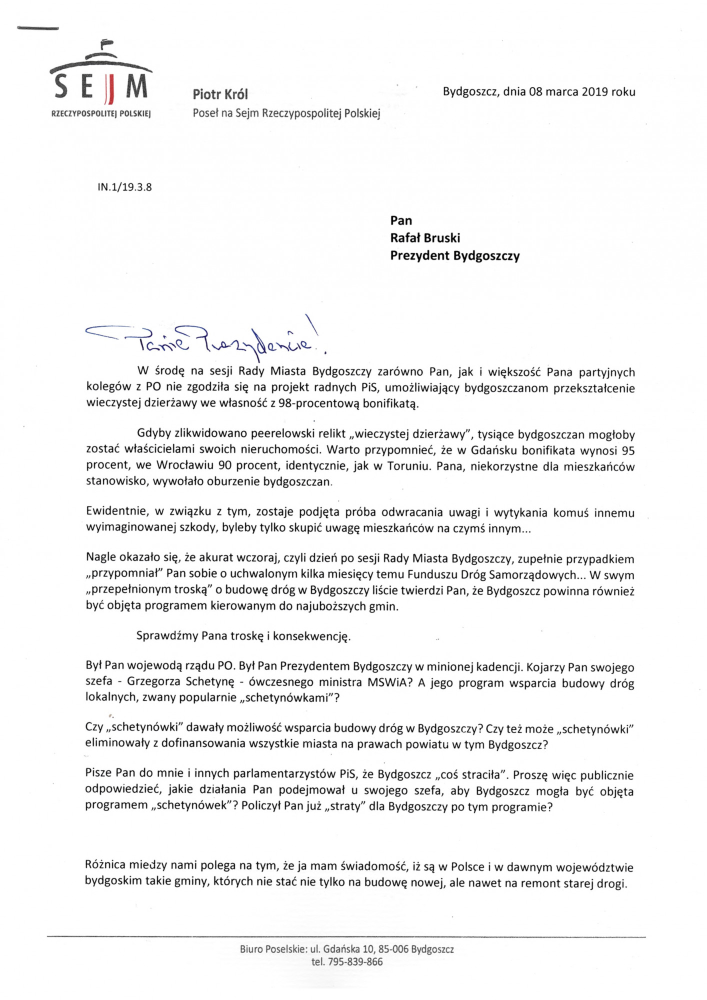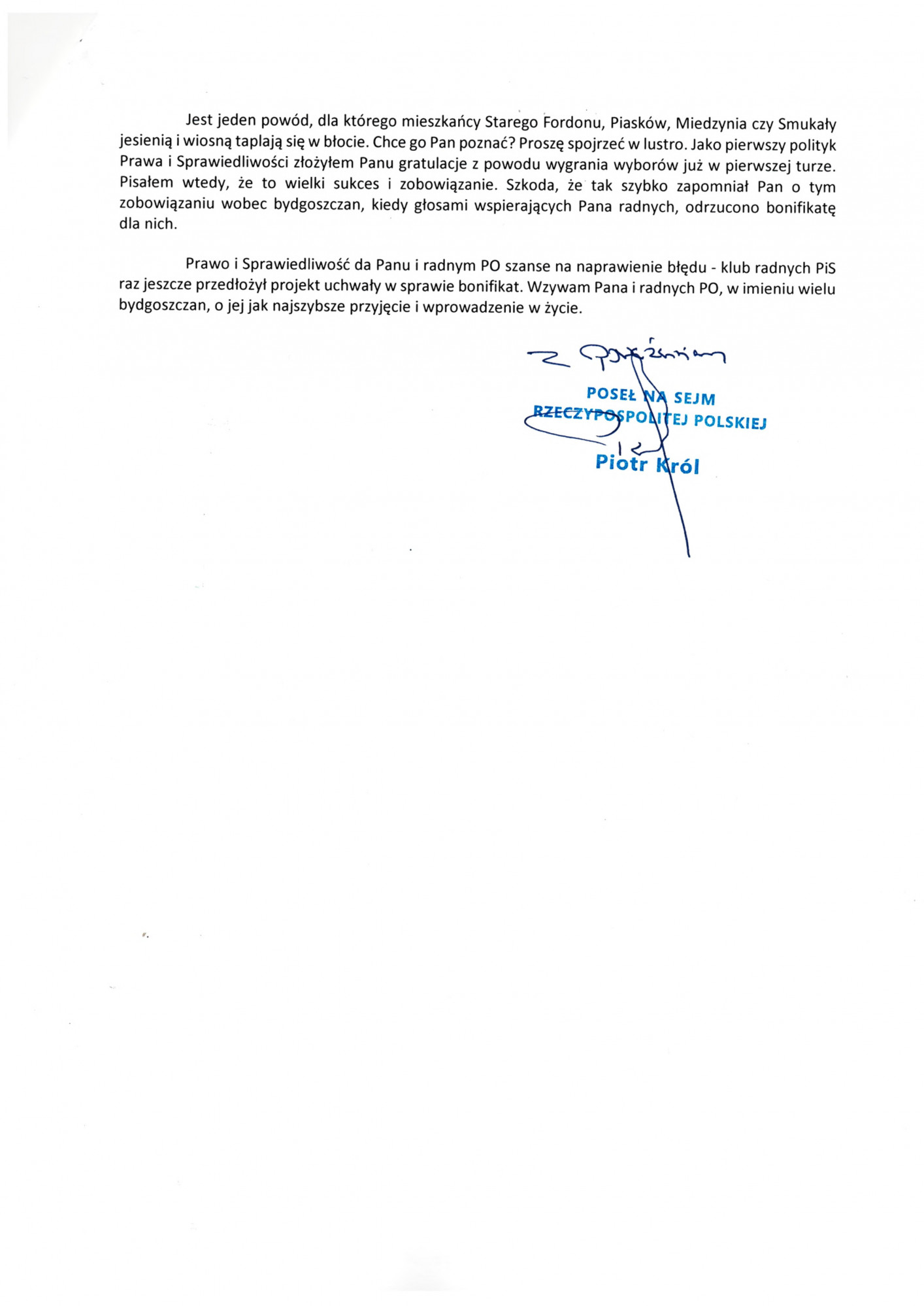 Prezydent Rafał Bruski zarzucił w liście otwartym posłom Prawa i Sprawiedliwości Ewie Kozaneckiej, Bartoszowi Kownackiemu, Piotrowi Królowi, Tomaszowi Latosowi i Łukaszowi Schreiberowi działanie na szkodę Bydgoszczy przy uchwaleniu ustawy o Funduszu Dróg Samorządowych. Prezydentowi Bruskiemu odpowiedział poseł Król. Stwierdził, że wskazana przez prezydenta szkoda jest wyimaginowana, a celem rozpowszechnienia treści listu otwartego jest odwrócenie uwagi bydgoszczan od odrzucenia przez niego i Radę Miasta Bydgoszczy projektu uchwały PiS podnoszącej bonifikatę przy przekształcaniu użytkowania wieczystego w prawo własności w naszym mieście. Listy obu polityków zamieszczamy poniżej...