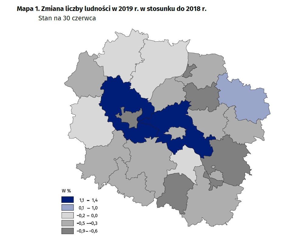 - współczynnik ogólnego salda migracji na pobyt stały wyniósł minus 1,2 osoby na 1000 ludności (w I półroczu 2018 r. było to minus 1,1 osób na 1000 mieszkańców),