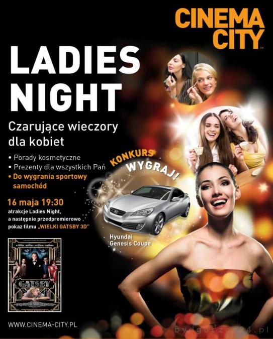 Wspólnie z przyjaciółkami wybierzcie się na wieczór pełen piękna i relaksu. Cinema City po raz kolejny zadba o świetny wygląd i doskonałe samopoczucie uczestniczek Ladies Night. Bądź piękna na wiosnę! ? poznaj najnowsze trendy w makijażu i modzie, dowiedz się jak prawidłowo pielęgnować skórę i odkryj swoje największe atuty. Skorzystaj z porad ekspertów i wraz z nadchodzącą wiosną wyglądaj świeżo, zmysłowo i modnie. Panie mogą także wziąć udział w wielkim konkursie, w którym główną nagrodą jest sportowy samochód Hyundai Genesis Coupe! Finał konkursu już w czerwcu!