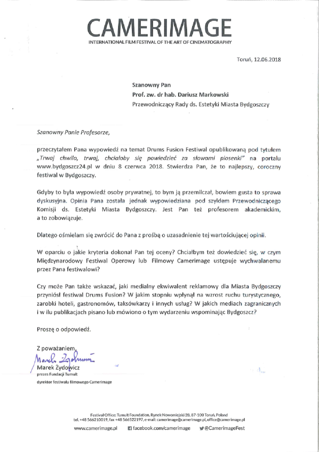 Po opublikowaniu opinii prof. dr. hab. Dariusza Markowskiego, przewodniczącego Rady ds. Estetyki Miasta Bydgoszczy, zatytułowanej „Trwaj chwilo, trwaj, chciałoby się powiedzieć za słowami piosenki”, w której uznał on, że festiwal "Drums Fusion, to najlepsza coroczna impreza w Bydgoszczy", list do naszej redakcji przysłał prezes Fundacji Tumult Marek Żydowicz. Treść listu dyrektora festiwalu filmowego Camerimage publikujemy poniżej: