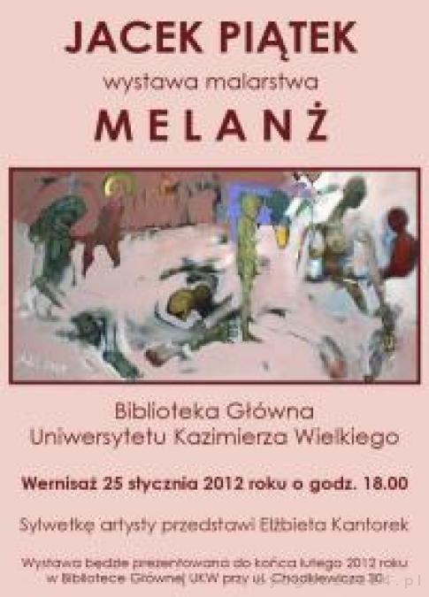 …Miejsce, do którego zostałem zaproszony zainspirowało mnie do pokazania prac różnych. Tak więc można będzie zobaczyć cały przekrój popełnionych przeze mnie śladów malarskich w różnej stylistyce, temacie, technologii i formie. Jestem podekscytowany możliwością wyeksponowania prac w dość złożonej przestrzeni Biblioteki Uniwersytetu Kazimierza Wielkiego. Czy moje prace wpiszą się w przestrzeń rytmów regałów i rzędów komputerowych stoisk? Myślę, że będzie ciekawie.Wystawa będzie prezentowana w Bibliotece Głównej UKW do końca lutego 2012.