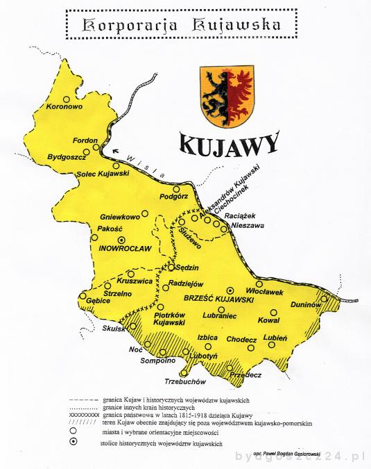 Jak sercem Pomorza Wschodniego pozostały kościersko-kartuskie Kaszuby, tak matecznik Kujaw sytuował się nad Gopłem i na radziejowsko-włocławskich równinach. Jeszcze w drugiej połowie XIX stulecia myślano tam o Bydgoszczy jako o starym, ważnym i bogatym mieście kujawskim. To właśnie tam Oskar Kolberg usłyszał i zanotował pięknie brzmiące porzekadło: ?Nie ma Kujaw bez Żuław?. Mianem Żuław określano zaś pas ziem okresowo zalewanych w przeszłości przez Wisłę, który wzdłuż wiślanej doliny ciągnął się na północ od okolic Solca Kujawskiego, dochodząc również do naszego miasta.