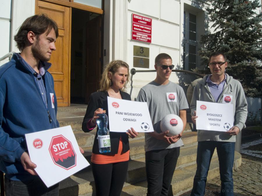 Dzisiaj przed Kujawsko-Pomorskim Urzędem Wojewódzkim młodzi socjaldemokraci zorganizowali pikietę w proteście przeciw decyzji wojewody Ewy Mes, zakazującej rozegranie meczu piłkarskiego między drużynami Polski i RPA na stadionie Zawiszy 12 października. Przynieśli ze sobą butelkę wody (z eliksirem odwagi) i piłkę – symboliczne dary, które mają dodać przedstawicielowi rządu w Bydgoszczy śmiałości w decyzji w stosunku do planowanego meczu.