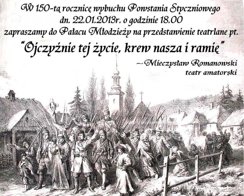 Bydgoska młodzież uczci pamięć o wydarzeniach sprzed 150 laty w skromny sposób. Pod okiem mgr Małgorzaty Jarocińskiej przygotowała przedstawienie “Ojczyźnie naszej krew i pamięć!”. Inscenizacja odbędzie się w Pałacu Młodzieży dzisiaj o godz. 18.00.