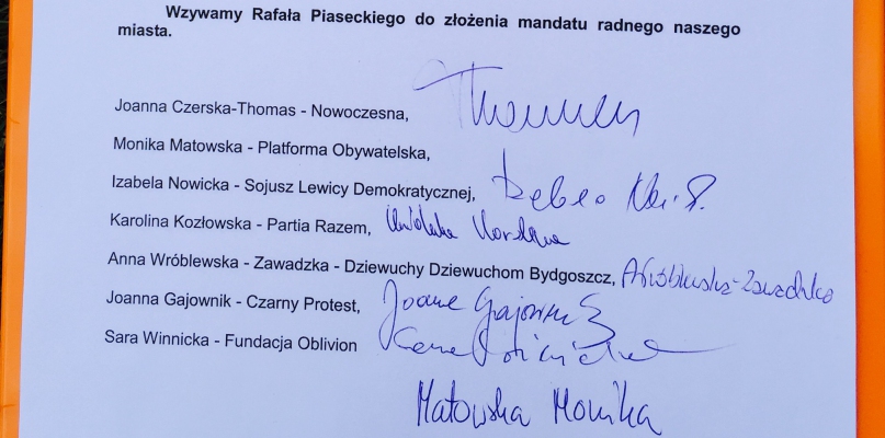 Dzisiaj na Starym Rynku, przed ratuszem, przedstawiciele siedmiu partii i organizacji wezwali Rafała Piaseckiego do złożenia mandatu radnego. W ogłoszonej petycji stwierdzili, że żona bydgoskiego radnego jest ofiarą nie tylko działań swojego męża, ale również jego partyjnych koleżanek i kolegów. W związku z tym wezwali działaczy Prawa i Sprawiedliwości do jednoznacznej postawy. Miałaby się ona wyrażać m.in. w tym, że udzieliliby pomocy ofierze działań radnego Rafała Piaseckiego.