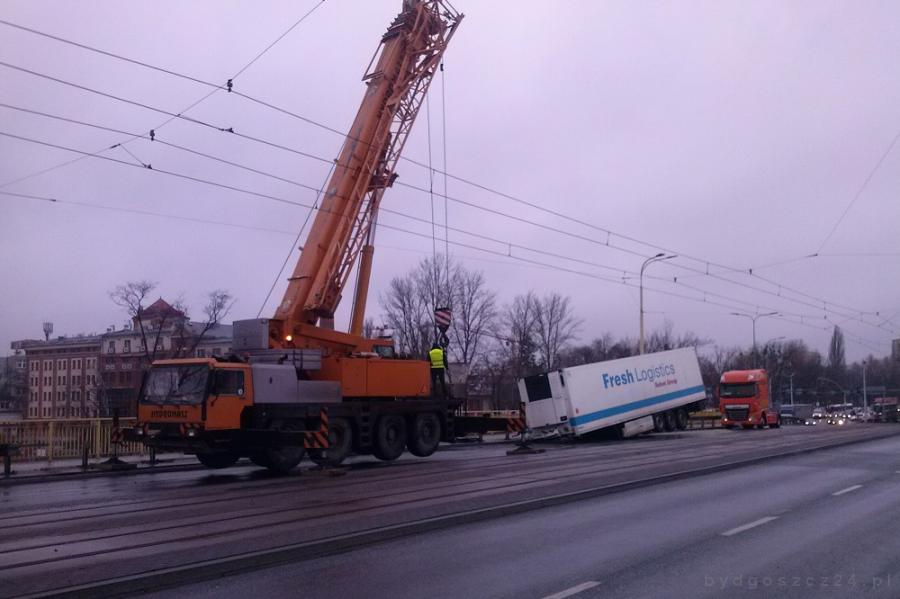 Naczepa jeszcze o godz. 10 blokowała pas ruchu od strony hotelu Słoneczny Młyn. Przybyli na miejsce policjanci zablokowali wjazd na most ze wszystkich stron.